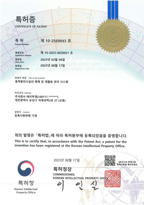 특허등록 [풍력발전시설의 해제 및 재활용 관리 시스템]