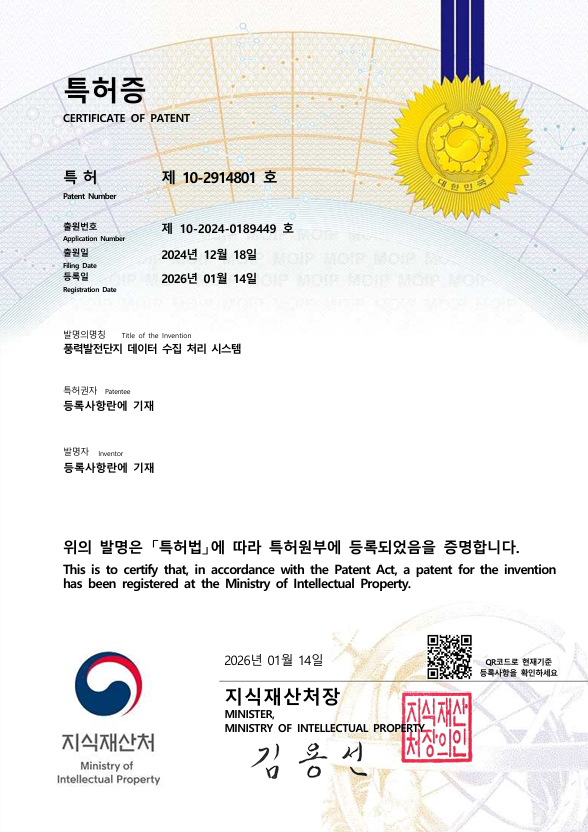특허등록 [풍력발전단지 데이터 수집 처리 시스템]